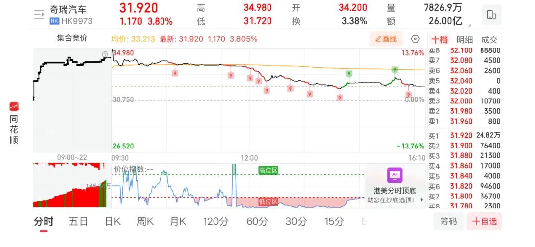 Ultimately, Chery's stock closed its first day of trading at HK$31.92, up 3.80% from the issue price. While this closing gain was nearly 10 percentage points lower than the opening surge, the day's turnover rate reached 3.38%, with trading volume hitting HK$2.6 billion.