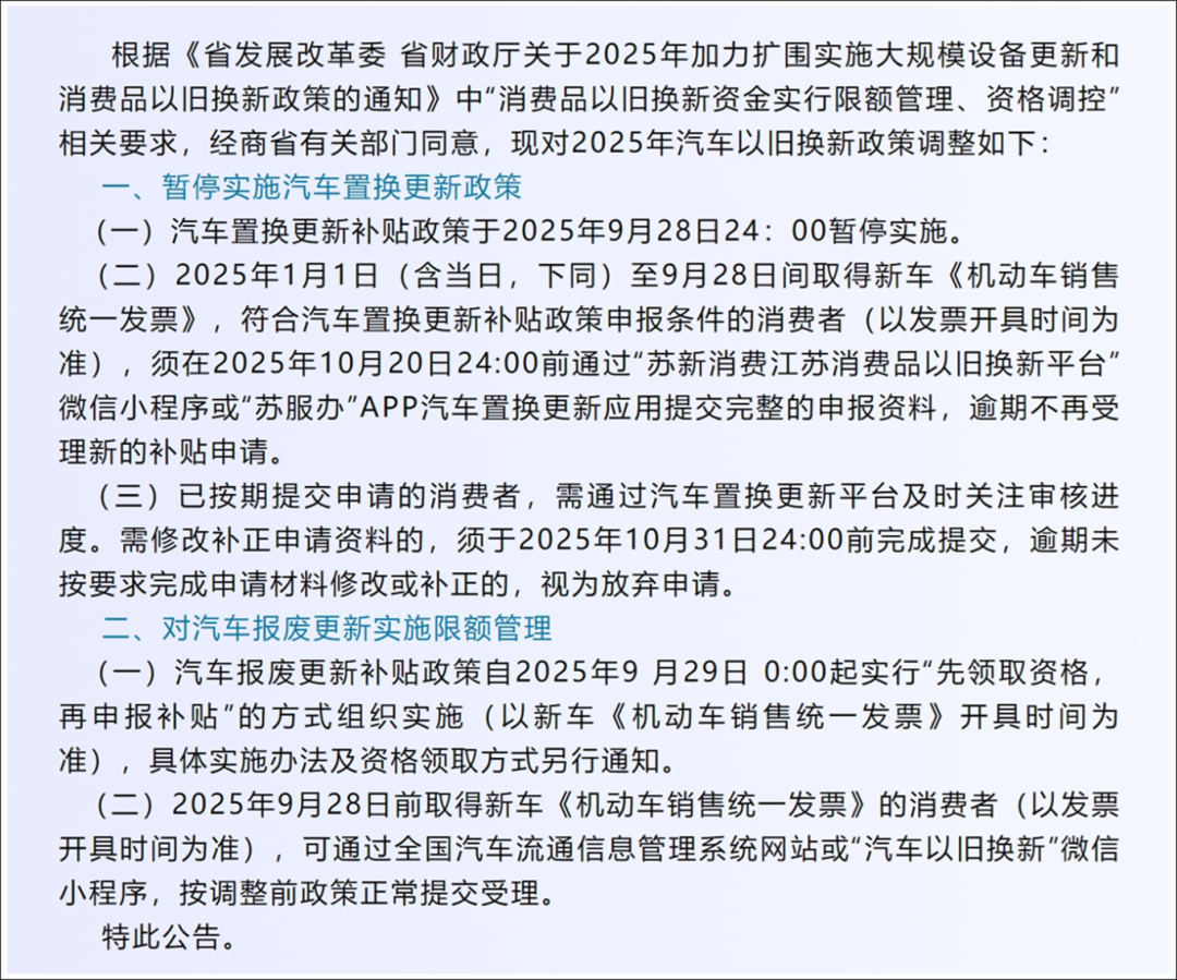 However, interestingly, as Jiangsu Province recently issued the “Announcement on Adjusting the 2025 Vehicle Trade-In Policy in Jiangsu Province,” announcing the suspension of the provincial vehicle replacement subsidy policy starting at 24:00 on September 28, 2025, and implementing quota management for vehicle scrapping and replacement, the automotive market's development trajectory seems to be taking an uncertain turn again.