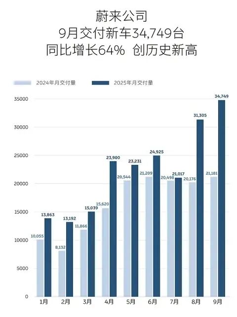 Within the "30,000-Unit Club," NIO and Li Auto exhibited contrasting development trajectories. NIO delivered 34,749 new vehicles in September, marking a 64% year-on-year increase and setting a new historical high. Among them, the NIO brand delivered 13,728 units, and the Onvo brand delivered 15,246 units. The most surprising September delivery was not the L90 (with 21,626 units delivered in two months since launch) but the Firefly, which sold 5,775 units.
