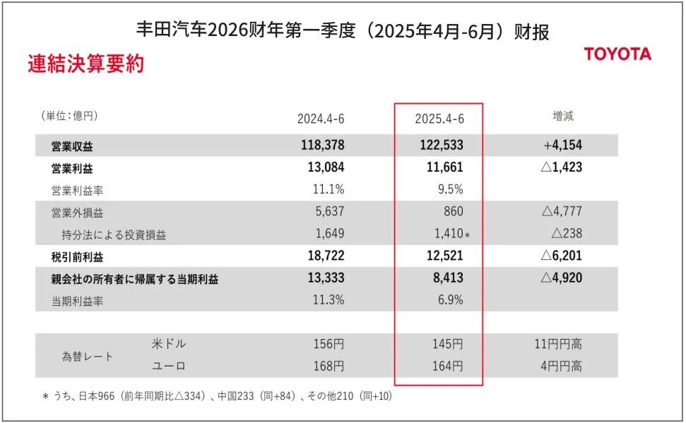 The financial report for the first quarter of the 2026 fiscal year (April-June 2025), released by Toyota on August 7, highlights this contrast. The data reveals that Toyota's revenue for the quarter reached JPY 12.25 trillion (approximately RMB 596.208 billion), a year-on-year increase of 3.5%. However, its operating profit decreased by 11% year-on-year to JPY 1.17 trillion (approximately RMB 59.644 billion). Meanwhile, Toyota's net profit also saw a significant decline of 37%, falling to JPY 841.4 billion (approximately RMB 41 billion). The company also announced a downward revision of its full-year operating profit forecast from JPY 3.8 trillion to JPY 3.2 trillion (approximately RMB 155.68 billion), a decrease of 16%. The net profit forecast was lowered by approximately 44%.