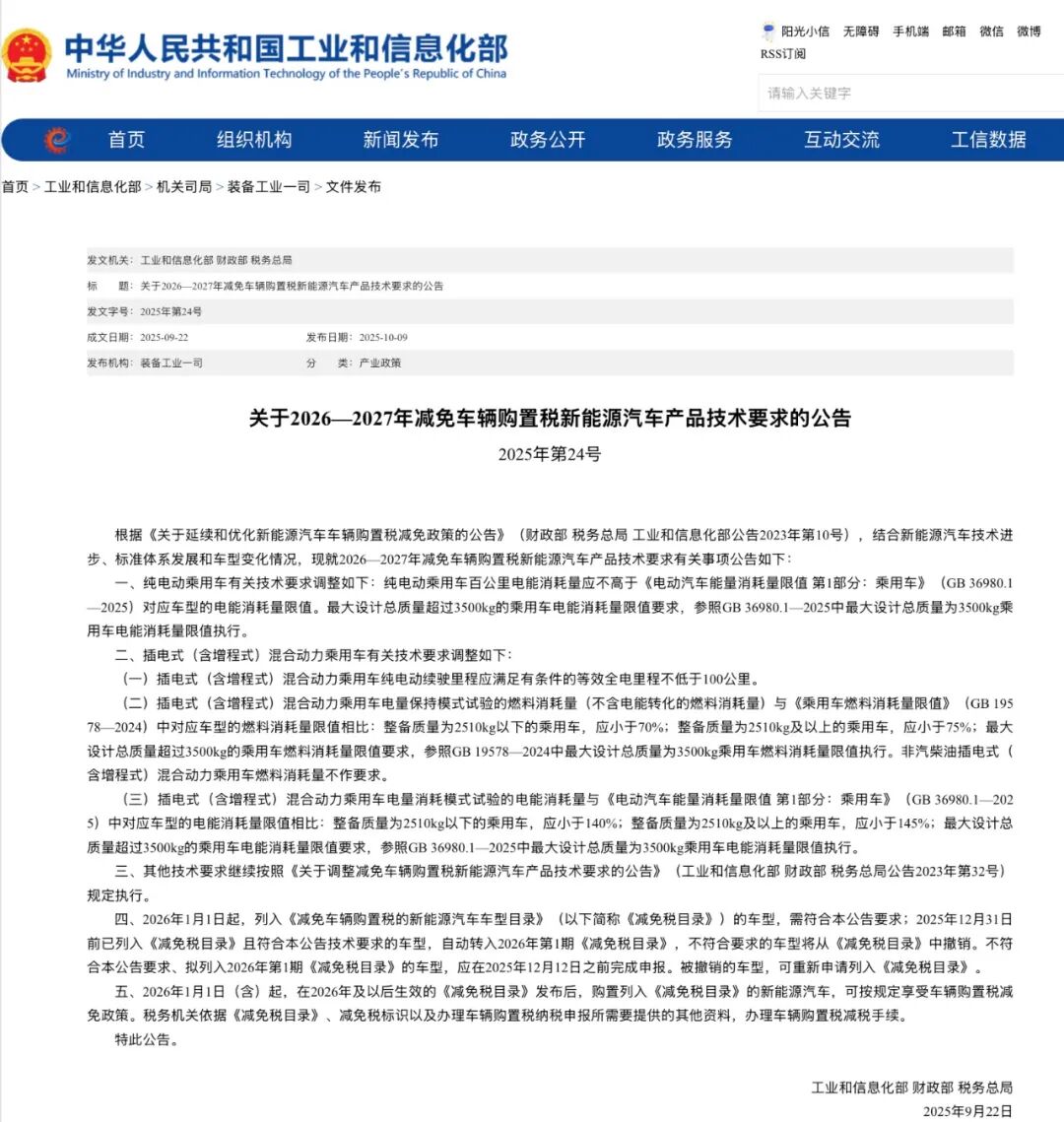 On October 9, the Ministry of Industry and Information Technology, the Ministry of Finance, and the State Taxation Administration jointly released the 'Announcement on Technical Requirements for New Energy Vehicles Eligible for Vehicle Purchase Tax Exemptions and Reductions from 2026 to 2027.' Vehicle purchase tax is a key factor influencing the consumption of new energy vehicles, and this adjustment is anticipated to significantly impact the new energy vehicle sector. The 'Announcement' sets higher technical standards for models qualifying for tax exemptions and reductions, motivating companies to develop new energy vehicles with advanced technology and fostering industrial advancement.