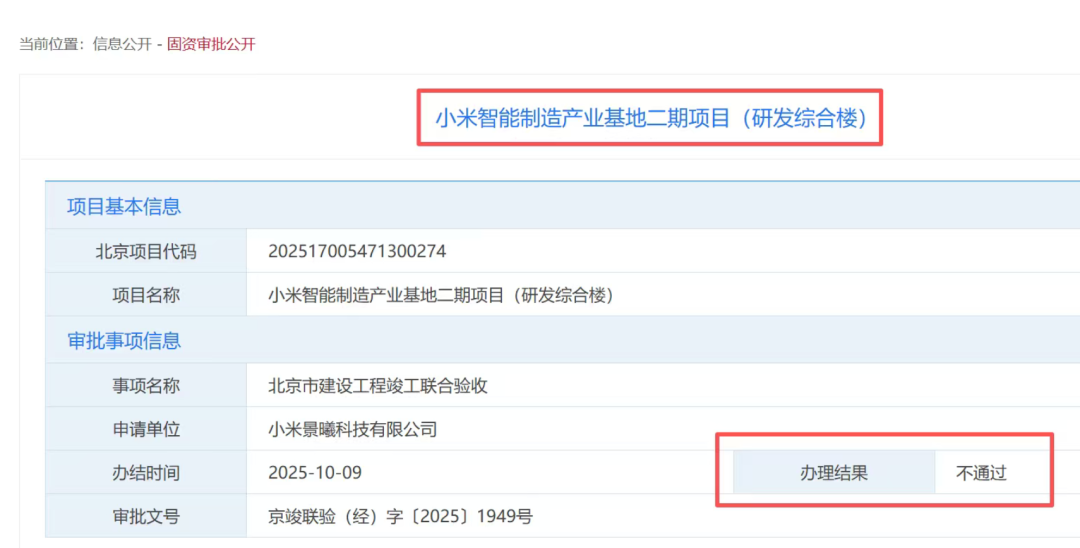 According to the official website of the Beijing Municipal Government, the acceptance of the R&D complex building of Xiaomi Motors' Phase II factory has not been passed, which may affect the upcoming surge in production capacity.