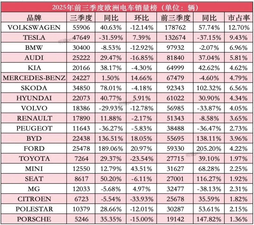 Skoda emerged as a strong contender in Europe this year, stable ranking fourth. It sold 34,850 units in Q3, up 78.01% year-on-year but down 4.18% quarter-on-quarter. From January to September, Skoda sold 92,343 units, up 102.32% year-on-year, capturing 6.56% of the market, closing in on BMW. Previously, its market share was below 4%. Audi sold 25,222 EVs in Q3, up 38.17% year-on-year but down 4.30% quarter-on-quarter. From January to September, Audi sold 81,840 units, capturing 5.81% of the market, ranking fifth. Including Skoda and Audi, Volkswagen Group's market share in Europe exceeds 25%.