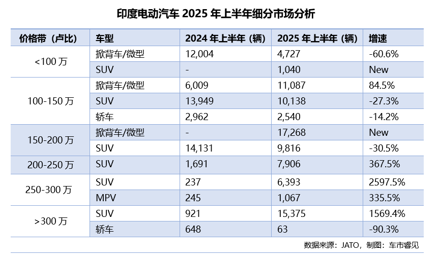 The report highlights that in the first half of 2025, Indian EV consumers shifted their focus from "low prices" to "long range" and "high performance." The premium SUV segment experienced exponential growth, with sales of models priced between 2.5 million and 3 million rupees surging over 2,500%. The top-tier market, priced above 3 million rupees, also saw a 1,500% increase. In stark contrast, the mid-range SUV market (1.5 million to 2 million rupees) declined by double digits, while the micro/small EV market (below 1 million rupees) contracted sharply by over 60%.