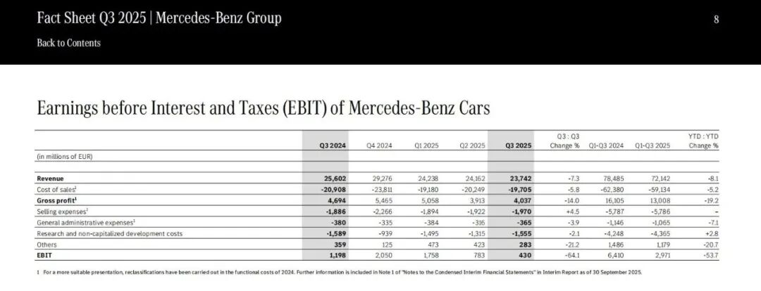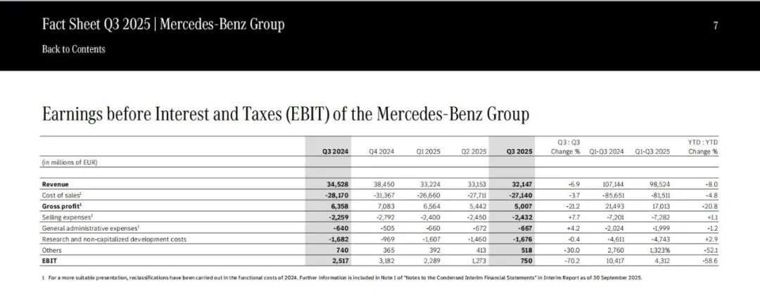 In Q3, Mercedes-Benz reported declines across several key financial metrics. Revenue stood at €32.15 billion, down 6.9% year-on-year; EBIT (Earnings Before Interest and Taxes) dropped to €750 million, a 70% plunge; and adjusted EBIT reached €2.1 billion, down 17%. Nevertheless, cash flow for the quarter hit €1.4 billion, with cumulative cash flow for the first nine months reaching €5.6 billion. Industrial net liquidity stood at €32 billion by the end of Q3, indicating relatively robust financial health.