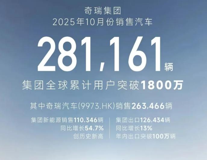 Chery Group sold 281,200 vehicles, including 110,300 NEVs, a 54.7% year-on-year surge, marking the first time its single-month NEV sales exceeded 110,000 units.