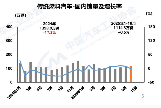 Sales of traditional fuel vehicles experienced a 0.6% growth in the first ten months. Although the increase is marginal, it successfully reverses the previous downward trend.