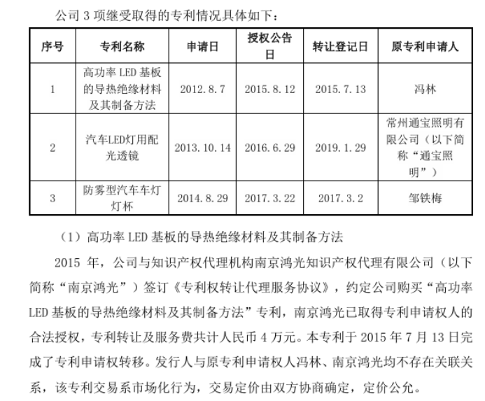 Furthermore, according to the response to the first round of review inquiries, among the company's 18 invention patents, three were purchased. The invention patent 'Thermally Conductive Insulating Material for High-Power LED Substrates and Its Preparation Method' was purchased by Tongbao Optoelectronics through the intellectual property agency Nanjing Hongguang, with a total patent transfer and service fee of RMB 40,000. The invention patent 'Anti-Fog Automobile Headlamp Cup' was purchased by Tongbao Optoelectronics through the intellectual property agency Changzhou Pengbo, with a total patent transfer fee of RMB 45,000.
