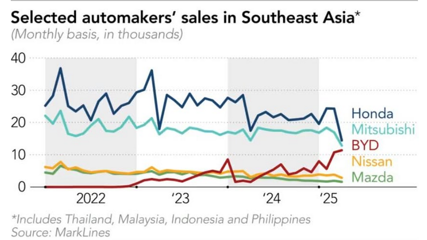 An industry insider, who spoke on condition of anonymity, said that competition from Chinese electric vehicle manufacturers such as BYD in regions like Thailand and Indonesia is making it increasingly difficult for Japanese automakers.