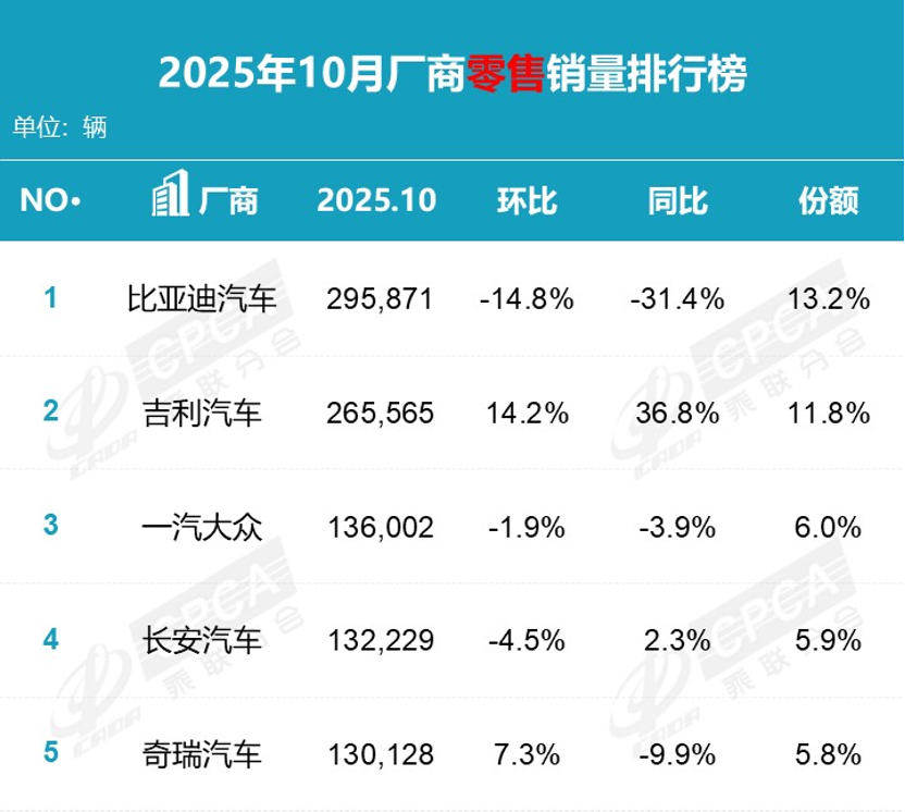 After several years of robust development in the domestic automotive market, alongside the electrification trend, Chinese local automakers have secured market dominance. Market enthusiasm and performance for these automakers clearly outstrip those of many joint venture automakers. According to the sales data for October released by the China Passenger Car Association, among the top five, Chinese domestic brands occupy four positions, while only one joint venture brand made it to the top five.