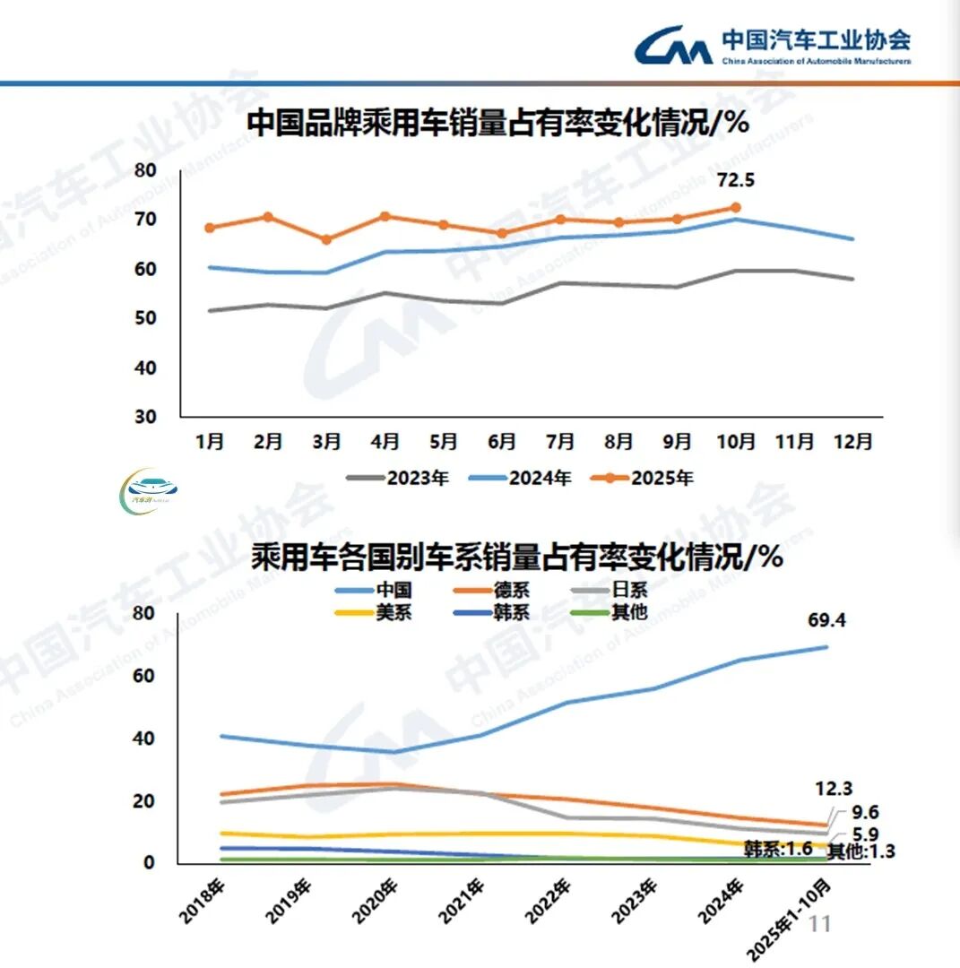 Chinese brand passenger vehicles continue to sustain robust growth, with sales reaching 2.148 million units in October, showing an 11.2% year-on-year increase, and a market share of 72.5%, showing a 2.4% year-on-year rise. From January to October, cumulative sales of Chinese brand passenger vehicles reached 16.799 million units, showing a 21.3% year-on-year increase, with a market share of 69.4%, showing a 4.8% year-on-year rise.