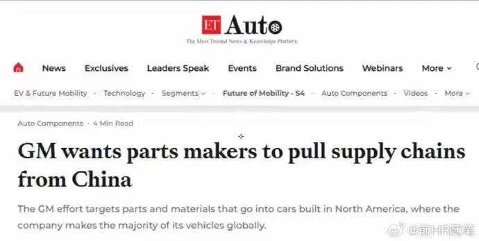 You may think that only Tesla is pursuing de - Chinafication, but General Motors has already taken action! Recently, Western media outlets like Reuters reported that the US automotive giant General Motors has instructed thousands of its suppliers to remove Chinese components from their supply chains, setting a deadline of 2027. This is not an isolated case. Previously, HP and Dell required the exclusion of Chinese components from their supply chains starting in 2025, while Apple plans to shift 70% of its production capacity out of China by 2027.