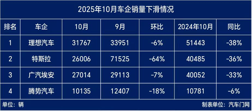 In October, Li Auto delivered 31,767 vehicles, representing a 38% year-on-year decline and a 6% month-on-month decrease. Currently, Li Auto ranks last in sales among the 'Weixiaoli' trio (NIO, XPeng, and Li Auto). More critically, since June this year, Li Auto's monthly sales have experienced year-on-year declines for five consecutive months, with the largest drop reaching 40%.