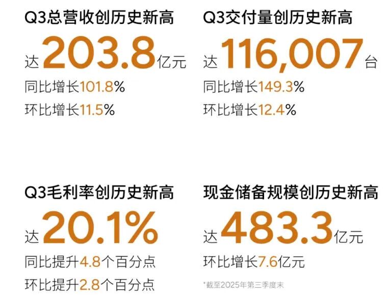 XPENG Motors’ third-quarter performance in 2025 demonstrated all-around growth, with several key financial metrics exceeding market expectations. The financial report revealed that XPENG’s total revenue for the quarter reached RMB 20.38 billion, marking a 101.8% year-on-year increase and setting a new single-quarter record.
