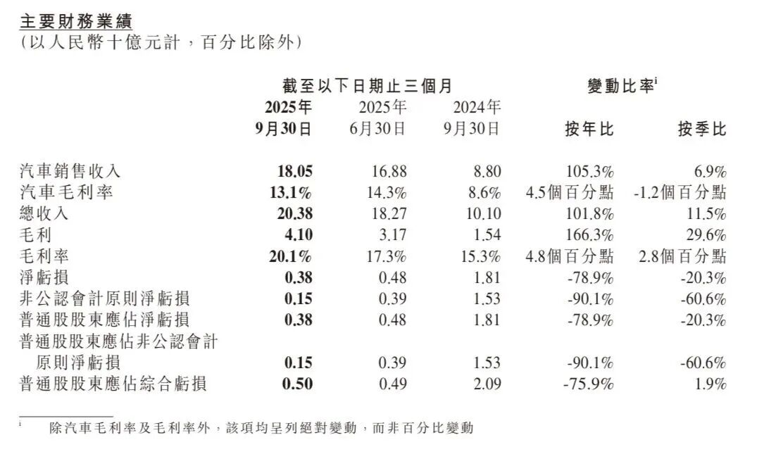 Looking ahead, XPENG Motors provided a positive outlook for the fourth quarter: deliveries are expected to reach 125,000 to 132,000 units, marking a 36.6% to 44.3% year-on-year increase; revenue is projected at RMB 21.5 billion to RMB 23 billion, representing a 33.5% to 42.8% year-on-year increase.