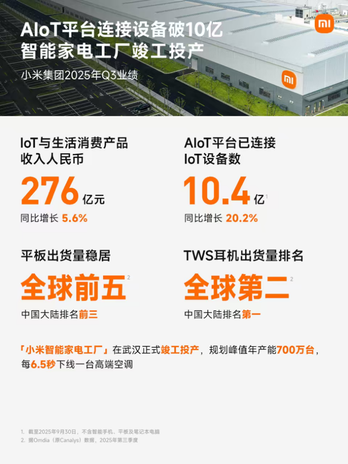 As of now, Xiaomi's AIoT devices (excluding smartphones, tablets, and laptops) have surpassed 1 billion units, with smartphone shipments consistently ranking among the top three globally and rapid growth in the automotive business. The ecological closed-loop formed by these three major businesses will generate strong user lock-in effects and cross-referral value.