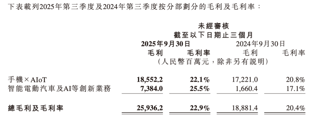 In the third quarter, the ASP (Average Selling Price) of Xiaomi's smart electric vehicles increased by 9.0% to RMB 260,100 per vehicle from RMB 238,600 in the third quarter of 2024. Meanwhile, without engaging in price wars or sacrificing margins for volume, the business achieved a gross profit margin of 25.5%, which is particularly commendable given the delivery of over 100,000 vehicles in a single quarter.