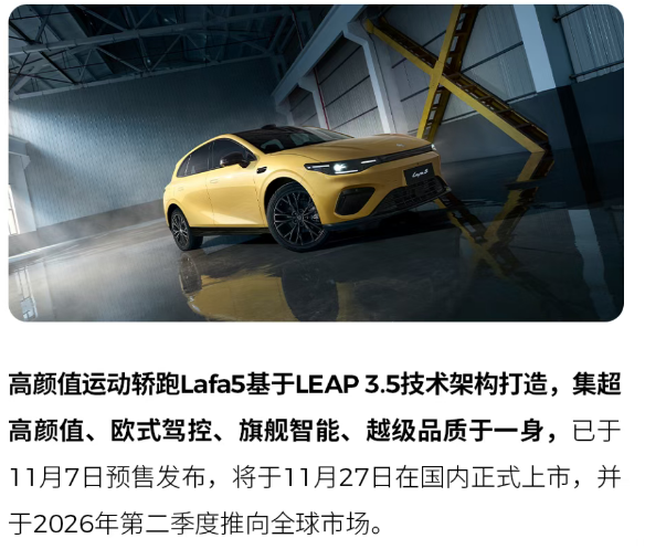 In addition, the all-new compact sports car "Lafa 5," which is already available for pre-sale and will be officially launched on November 27, will also be introduced to the global market in the second quarter of 2026 as a global model.