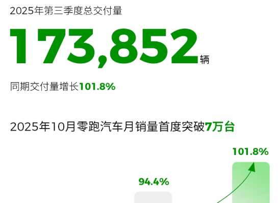 A total of 173,852 new cars were delivered in the third quarter, a year-on-year increase of 101.77% and a nearly 30% increase quarter-on-quarter. Among them, over 66,000 units were delivered in September, and more than 70,000 units were delivered in October, maintaining the first place in sales among new energy vehicle brands for eight consecutive months.