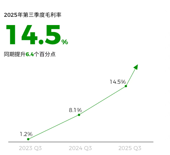As we all know, adhering to a "cost-performance" strategy is one of the core driving forces behind the rapid increase in sales of Leapmotor's new cars. However, under the strong scale effect, Leapmotor's gross profit margin in Q3 was pushed to 14.5%, compared to only 8.1% in the same period last year, and it also increased by 0.9 percentage points compared to the second quarter.