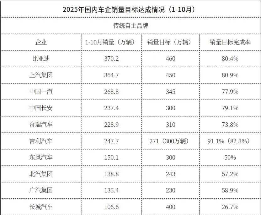 Now, with only the last two months remaining in 2025, and as major mainstream automakers continue to release their latest sales data, the annual competition in the Chinese auto market has quietly entered its final big push stage. Looking back at the sales targets set by automakers at the beginning of the year, which companies have already achieved their goals ahead of schedule? The reporter has compiled the following information.