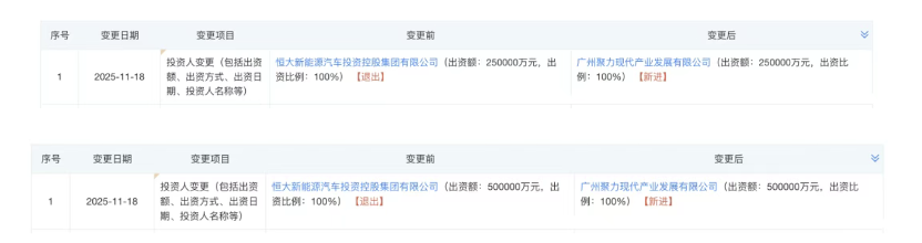 According to the Qichacha APP, Guangzhou Juli Modern Industrial Development Co., Ltd., a subsidiary of Guangzhou's state - owned assets, has officially completed its transformation. It has now become the wholly - owned controlling shareholder of Evergrande Intelligent Automobile Co., Ltd. and Evergrande New Energy Vehicle Co., Ltd. The original shareholder, Evergrande New Energy Vehicle Investment Holding Group, has completely exited the scene.
