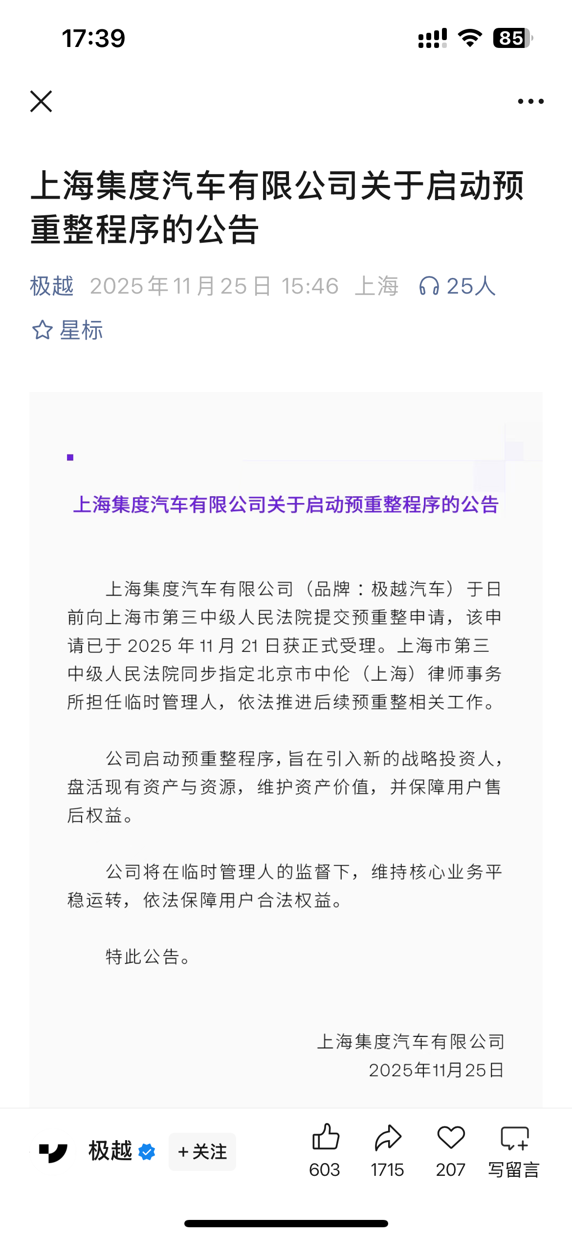 JIYUE still boasts commendable intelligent driving technology and automotive manufacturing foundations, with its Apollo system and SEA architecture earning recognition in the industry. If it can leverage pre-reorganization to attract truly committed and resourceful investors, there may still be a chance for revival.