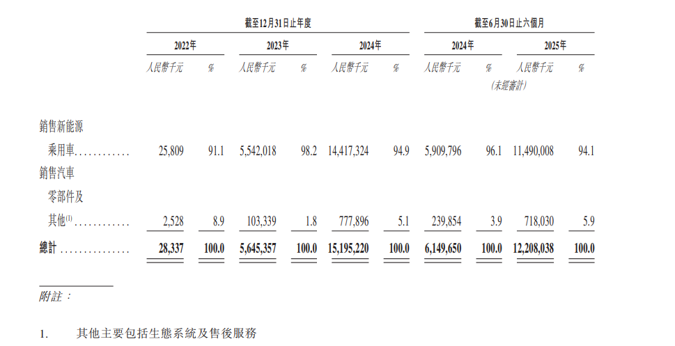 Breaking it down, revenue from the main business of complete vehicles has grown rapidly. Avatr's complete vehicle revenue from 2023 to the first half of 2025 was RMB 5.542 billion, RMB 14.4173 billion, and RMB 11.49 billion, respectively. From the perspectives of revenue and complete vehicle revenue, the first half of this year has already surpassed the performance of the entire previous year. In the first half of this year, the year-on-year growth rate of complete vehicle revenue also reached as high as 94.4%. Additionally, Avatr's revenue from other businesses (including ecosystems and after-sales services) increased from RMB 103 million in 2023 to RMB 777.9 million in 2024, accounting for 1.8% and 5.1%, respectively. As the number of complete vehicles in ownership gradually increases, non-complete vehicle revenue is rising rapidly and has enormous potential.