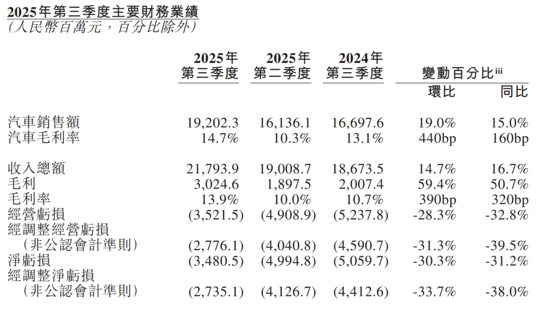 Although the loss is narrowing—Q3 2025 net loss was RMB 3.48 billion, down 31.2% YoY; adjusted net loss under non-GAAP was RMB 2.735 billion, down 38.0% YoY—the sheer existence of massive losses brutally exposes a reality: Despite Li Bin's aggressive 'efficiency revolution,' the company's enormous fixed cost and expense structure remains a profit-devouring 'beast.'