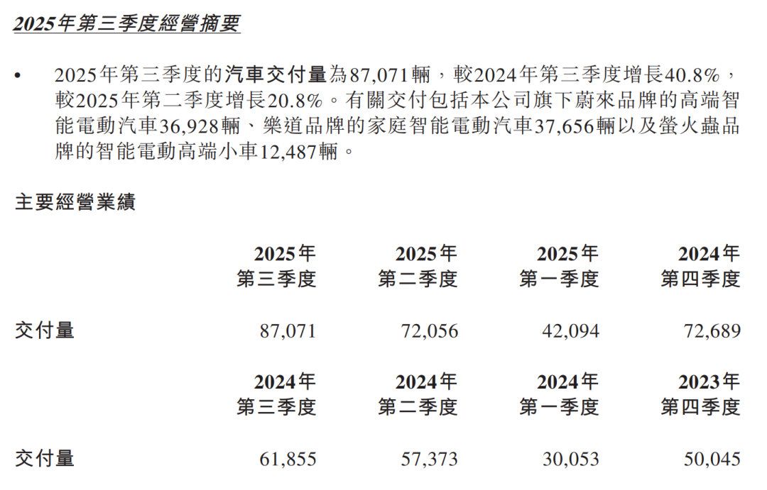 Record-breaking sales and revenue: In Q3, NIO delivered 87,071 units, up 40.8% YoY and 20.8% QoQ. Revenue reached RMB 21.79 billion, up 16.7% YoY and 14.7% QoQ, both setting new company records.
