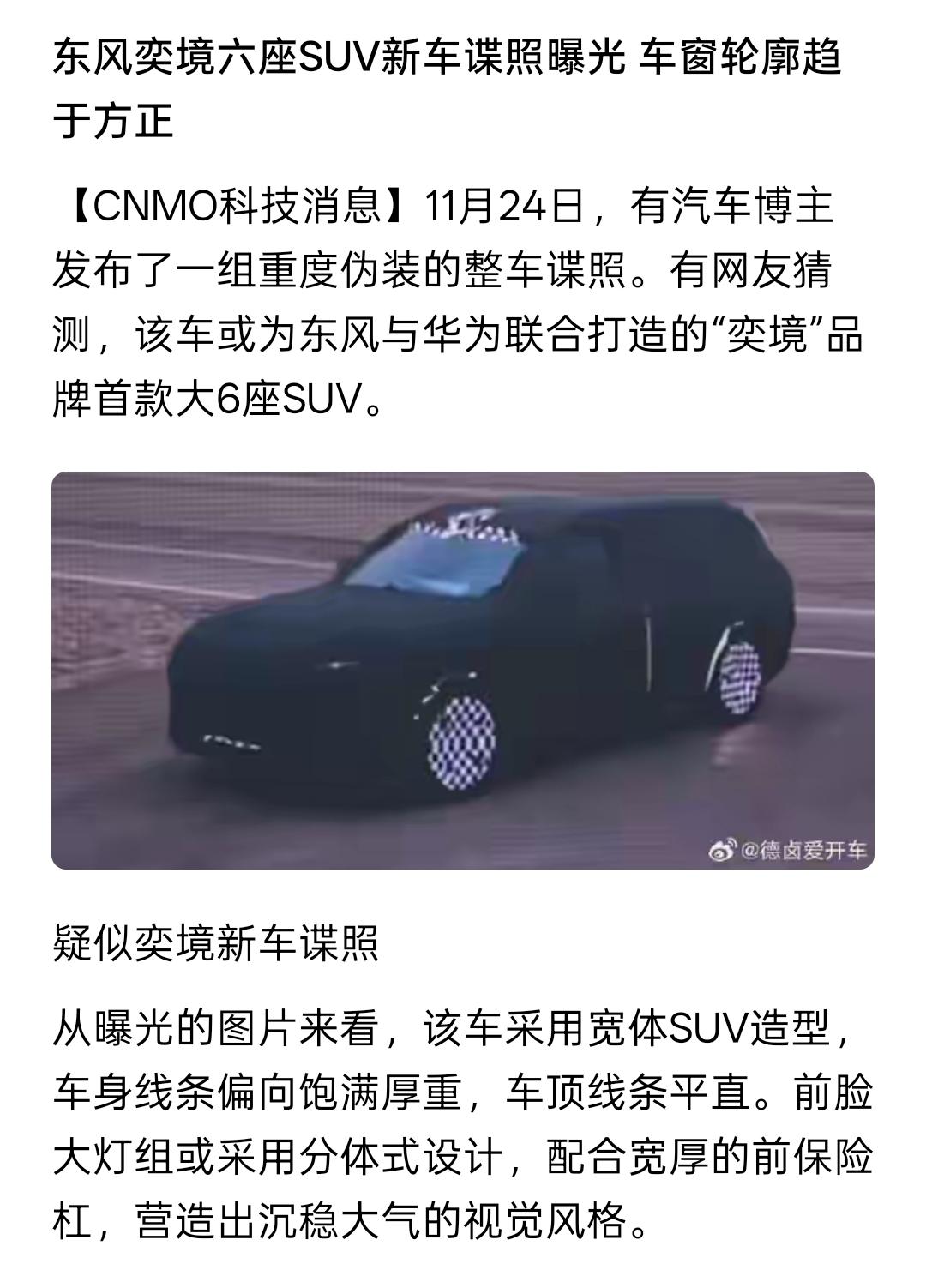 On November 24, CNMO Tech reported that a blogger had posted spy photos of a suspected new six-seater SUV from Dongfeng EIINE, noting that the window outlines were more square-shaped. This suggests that the new brand is gradually making its way into the market.