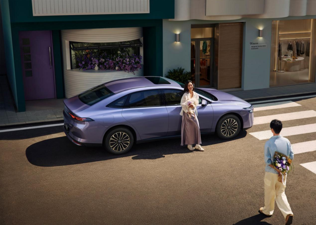 The waistline on the side of the car extends from the front to the rear, slightly expanding outward with a delicate arc at the rear wheel arch, appearing minimalist and natural. It's worth mentioning that the charging port of the new car is located on the rear fender area, and it is equipped with a black roof and hidden door handle design. This combination not only appeals to young consumers but also further enhances the sporty aura of the entire vehicle. In terms of body dimensions, the new car measures 4831mm in length, 1885mm in width, and 1491mm in height, with a wheelbase of 2815mm, positioning it as a mid-sized plug-in hybrid car. For body colors, the new car offers six options for consumers: Rizhao Gold, Wind Chime Purple, Flowing Light Silver, Rock Mountain Gray, Obsidian Black, and Pearl White.
