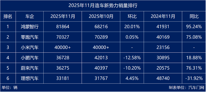 On December 1st, major emerging automakers successively released their sales reports for November. Among them, HiMode took the top spot with 81,864 deliveries, closely followed by Leapmotor with 70,327 units. Together, they formed the 'first tier' of these new players. Xiaomi Auto maintained monthly sales exceeding 40,000 units for three consecutive months. Of course, a few emerging automakers also experienced sales declines.