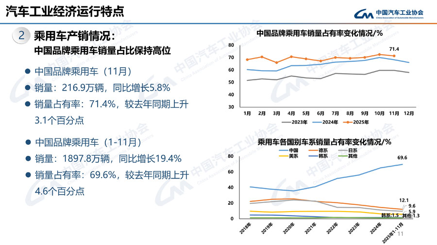 From January to November, Chinese brand passenger cars accumulated sales of 18.978 million units, up 19.4% year-on-year, accounting for 69.6% of the total passenger car sales. This represented a 4.6 percentage point increase in market share compared to the same period last year. Among the major foreign brands, American and Korean brands saw sales increases to varying degrees, while the other three major brands reported declines.