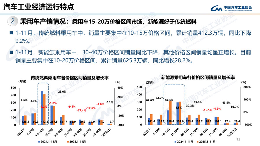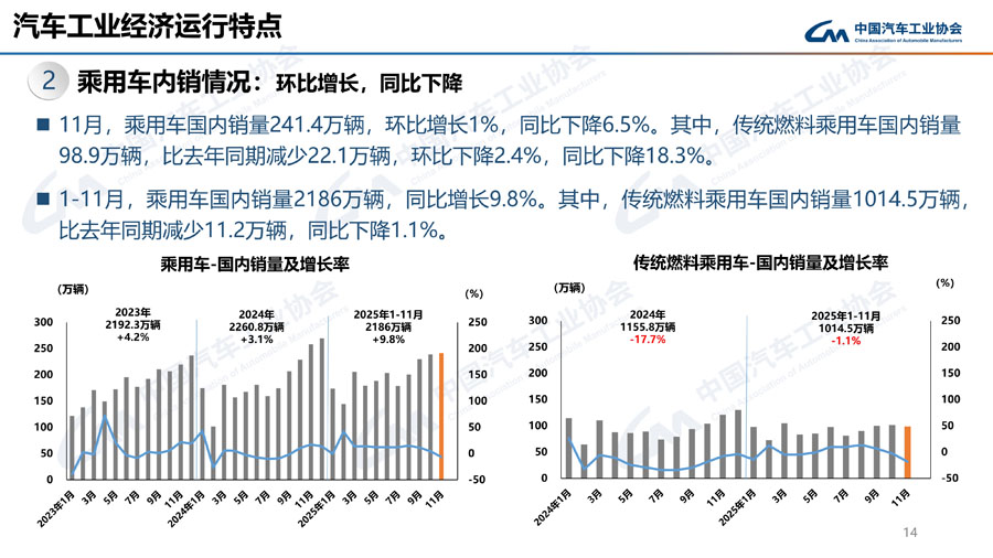 In November, enterprise-level production and supply maintained a relatively brisk pace, enabling passenger car sales to achieve both month-on-month and year-on-year growth despite a high comparative base. During this month, a total of 3.037 million passenger cars were sold, marking a 2.6% increase from the previous month and a 1.2% rise year-on-year. Among the primary passenger car categories, MPV sales experienced a slight month-on-month decline, whereas the other three major categories saw varying degrees of growth. When compared to the same period last year, basic passenger cars (sedans) and sport utility vehicles (SUVs) posted slight increases in sales, while MPVs and cross-type passenger cars witnessed double-digit declines.