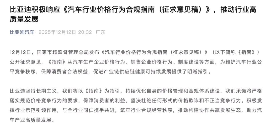 Following the release of the "Guidelines," several automakers swiftly issued statements expressing their support. This positive response reflects the industry's urgent need for standardized competition.