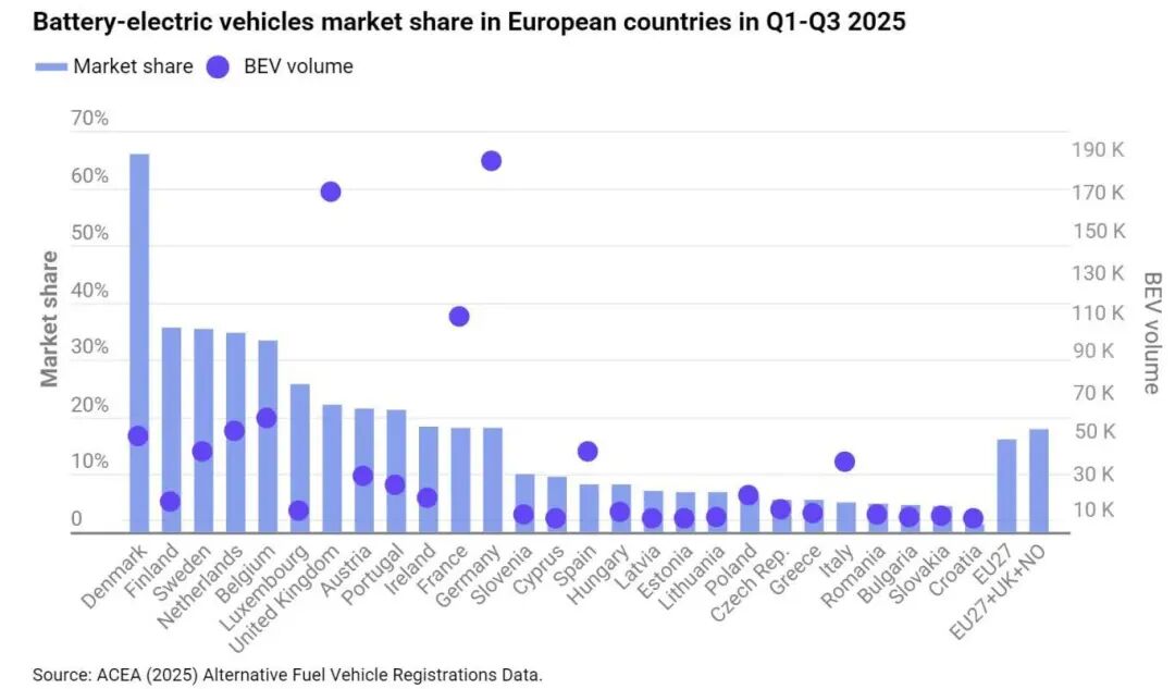 In fact, the data is most persuasive. The overall trend of Europe's electric vehicle market is steadily accelerating. In Q3 2025, the sales share of pure electric vehicles in the EU reached a historic high of 17.4%. From January to October, the EU registered 1,473,447 new pure electric vehicles, accounting for 16.4% of the market share. The EU's four largest markets (collectively accounting for 62% of pure electric vehicle registrations) all achieved growth: Germany (+39.4%), Belgium (+10.6%), the Netherlands (+6.6%), and France (+5.3%).