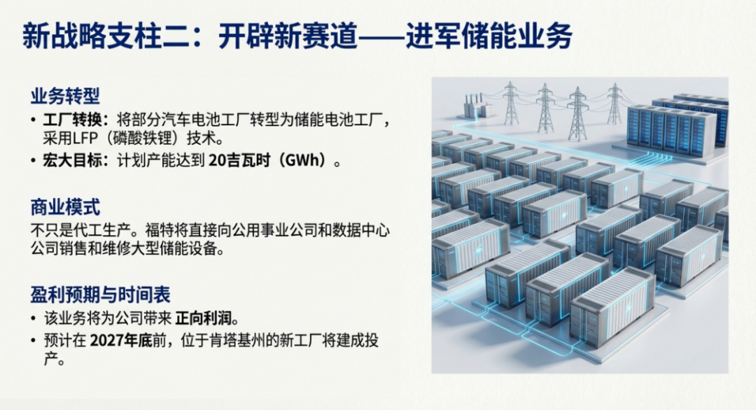 Another cornerstone of Ford's electrification strategy is its foray into the energy storage market. Ford is repurposing its battery factories in Michigan and Kentucky to manufacture 20 gigawatt-hours (GWh) of energy storage batteries utilizing lithium iron phosphate (LFP) technology. Ford not only intends to sell these large-scale storage units to utility companies and data centers but also to offer related service businesses. This venture is anticipated to commence in 2027 and is viewed as a new avenue for company profit growth.