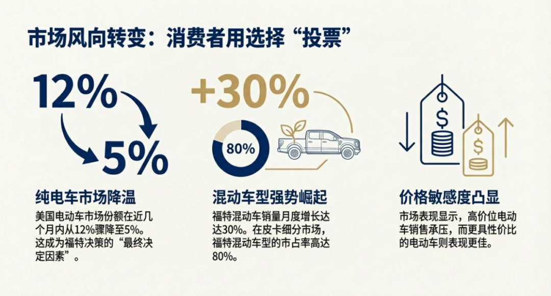 The primary catalyst for this shift is evolving consumer preferences: demand for high-priced electric vehicles has decelerated, while demand for hybrids has accelerated. For instance, Ford's hybrid vehicle sales recently experienced a 30% increase, with hybrid market share in the truck segment reaching approximately 80%. Consequently, Ford has opted to provide customers with a broader range of choices through 'propulsion diversity,' while simultaneously reducing the company's carbon footprint.