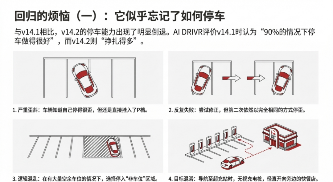 Degraded Parking Logic: Some tests have revealed that during automatic parking, version 14.2 may park at an angle or choose incorrect areas, such as striped no - parking zones or specific reserved spots.
