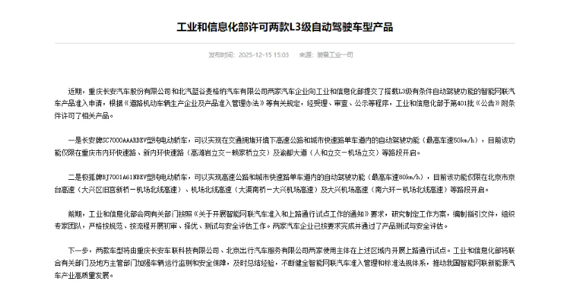 On December 15th, the MIIT official website announced that the Changan SC7000AAARBEV all-electric sedan (Changan Deepal SL03) and the Arcfox BJ7001A61NBEV all-electric sedan (BAIC Arcfox Alpha S6) have been granted the first batch of L3 conditional autonomous driving vehicle approvals in China. This marks the dawn of a new era for high-level intelligent driving in China, transitioning from previous 'testing and demonstration phases' to 'commercial deployments'.