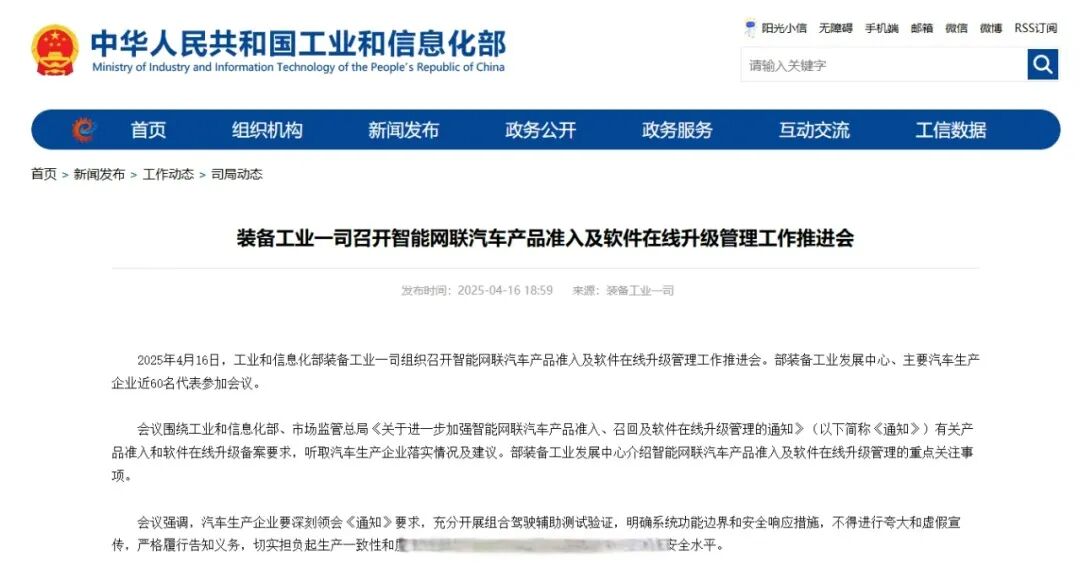 As early as April 16 of this year, the Equipment Industry Department I of the Ministry of Industry and Information Technology organized a meeting to advance the management of intelligent connected vehicle product access and software online upgrades. Nearly 60 representatives from the ministry's Equipment Industry Development Center and major automotive manufacturers attended.