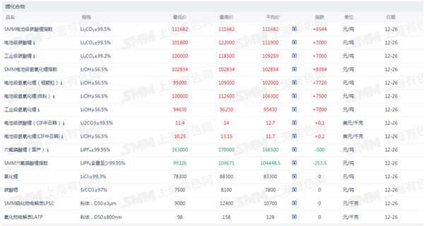 According to Shanghai Metals Market, battery-grade lithium carbonate is priced between RMB 101,800 and 122,000 per ton, with an average price of RMB 111,900 per ton, up RMB 7,000 per ton from the previous workday; industrial-grade lithium carbonate ranges from RMB 100,000 to 118,500 per ton, averaging RMB 109,250 per ton, also up RMB 7,000 per ton from the previous workday. Currently, upstream lithium salt plants primarily focus on fulfilling long-term agreement orders, with fewer spot transactions. Downstream material plants generally remain cautious about the rapid price increases, relying mainly on long-term agreements and customer-supplied lithium carbonate, adjusting their procurement pace dynamically based on next month's production plans. However, some companies are forced to accept high-priced supplies to maintain production due to urgent needs. Such high-priced transactions continue to drive up today's spot price levels.
