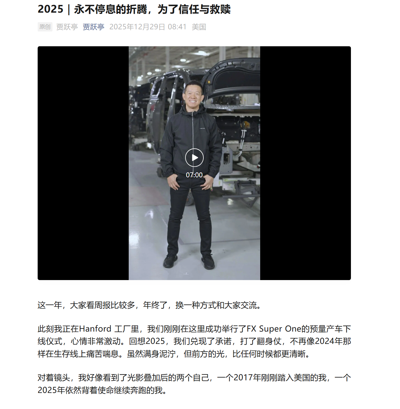 In any case, Jia Yueting's 2025 year - end recap portrays him as a genuine entrepreneur. With notable achievements, the courage to face his regrets, and renewed recognition from long - standing shareholders, he has already outperformed many.