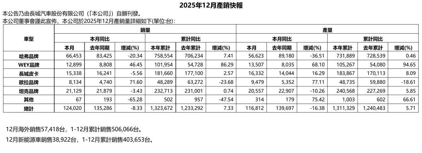 Great Wall Motors achieved a new annual sales record with a 7.33% year-on-year increase. Its new energy vehicle sales reached 403,700 units, accounting for over 30% of total sales, while overseas sales accounted for as high as 38.2%, with both strategic segments setting new historical records.