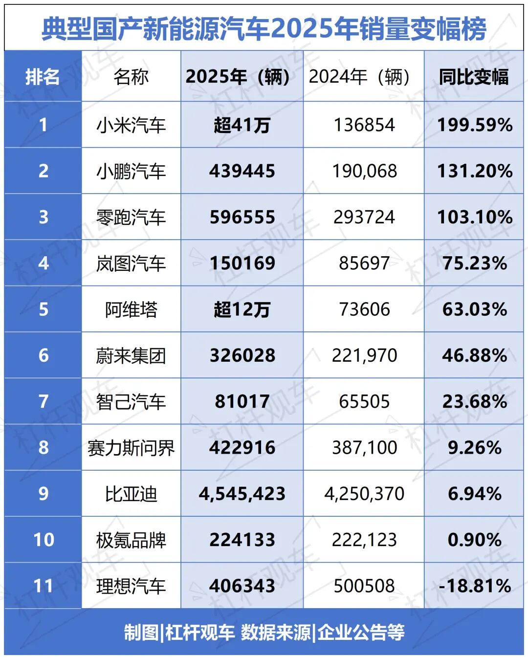 As depicted below, despite encountering controversies along the way, Xiaomi Auto emerged as the top performer in terms of growth rate for 2025, boasting a staggering 199.59% increase and surpassing 410,000 units in annual sales. XPeng followed closely with a 131.2% growth, while Leapmotor achieved a 103.1% surge.