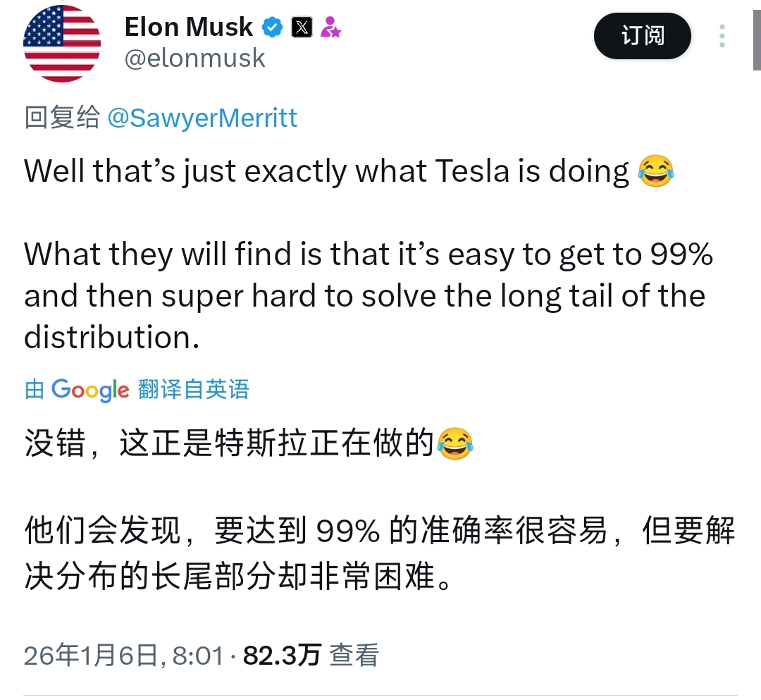 As a longtime 'rival' in the autonomous driving arena, Tesla founder Elon Musk quickly responded to NVIDIA's moves: 'Well, this is exactly what Tesla is doing. They'll find it's easy to reach 99%, but solving the distributed long-tail problems is incredibly difficult.'