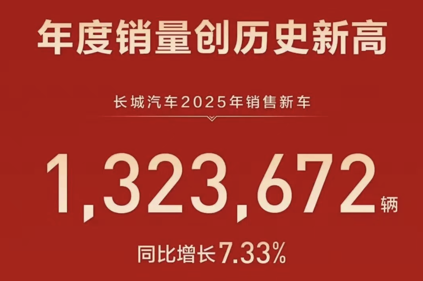 In 2025, Great Wall sold a total of 1,323,672 vehicles, up 7% year-on-year, setting a new annual sales record. Among them, new energy vehicles sold 403,653 units, up 25.44% year-on-year, while overseas sales reached 506,066 units, up 11.68% year-on-year.