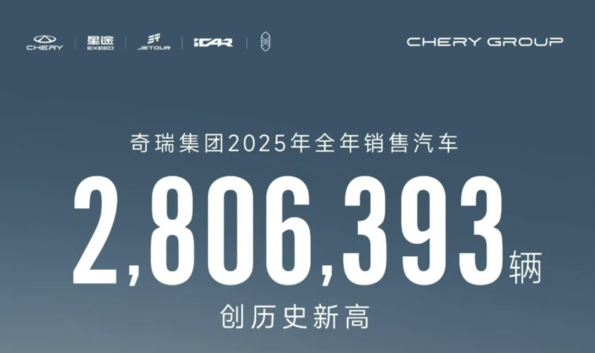 Data shows that Chery Group sold a total of 2,806,393 vehicles in 2025, up 8% year-on-year, setting a new historical record. Among them, Chery Automobile sold a cumulative 2,631,381 vehicles, up 8% year-on-year.