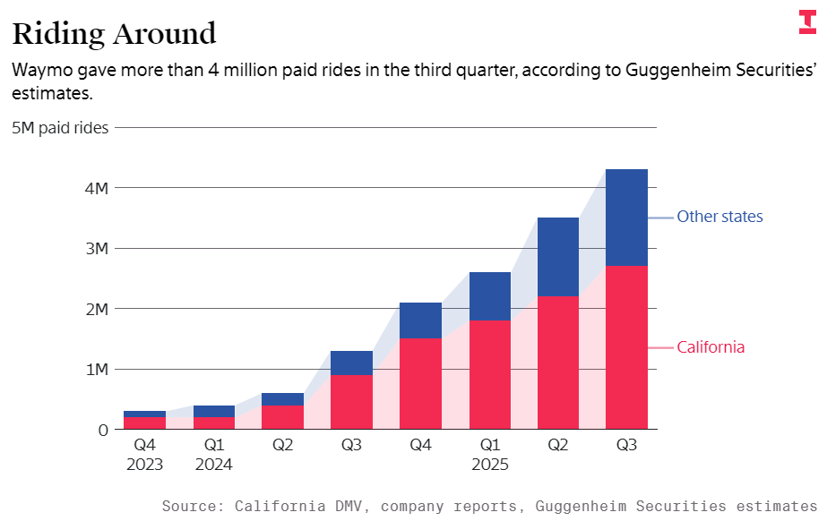 Travel Data: Guggenheim Securities estimates that Waymo provided over 4 million paid rides in Q3. (Sources: California DMV, corporate reports, Guggenheim Securities estimates)